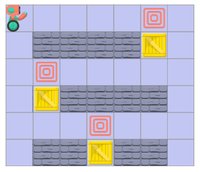 Im Programm rechts haben hat sich leider ein (oder mehr) Fehler eingeschlichen. Kannst du den Code so verändern, dass hinterher alle Kisten bei Weihnachtsbäumen stehen?