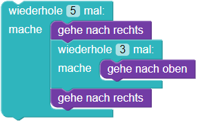 Dabei wird alles, was beim grünen Block eingerückt ist, 5-Mal ausgeführt. Alle Befehle im orangenen Block werden 3-mal ausgeführt. Der Roboter geht also 5-Mal: