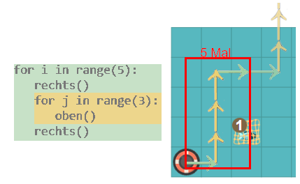 for loop in range(5): rechts() oben()Dieser Code lässt den Roboter fünf Mal einen Schritt nach rechts und einen Schritt nach oben gehen.